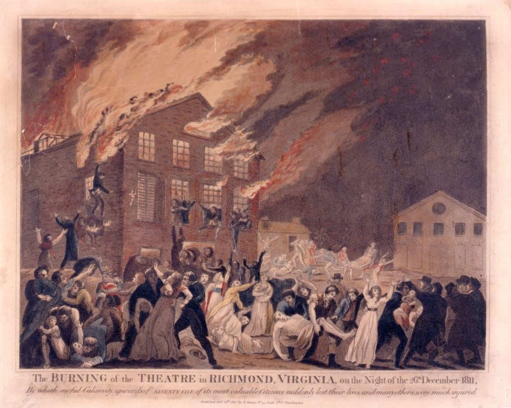 On December 26, 1811, 643 festive patrons filled the seats of the Richmond Theatre on Broad Street. Moments before the second act, an innocent mistake by a stagehand caused a chandelier to collide with scenery made of flammable materials.