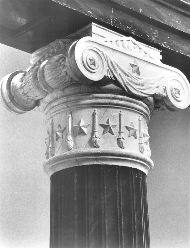 The interior of the church features more symbols of mourning. Capitals on the columns on each side of the pulpit feature upside-down torches, stars, and drapery. The upside-down torches symbolize life snuffed out, the stars represent heaven, and the drapery references a burial shroud. The columns under the balcony are capped with sarcophagus-shaped capitals. Unique to Mills’ design is a distinctive menorah–shaped item which is shown above the capitals. A sarcophagus shape can be seen over each doorway and window, both interior and exterior.