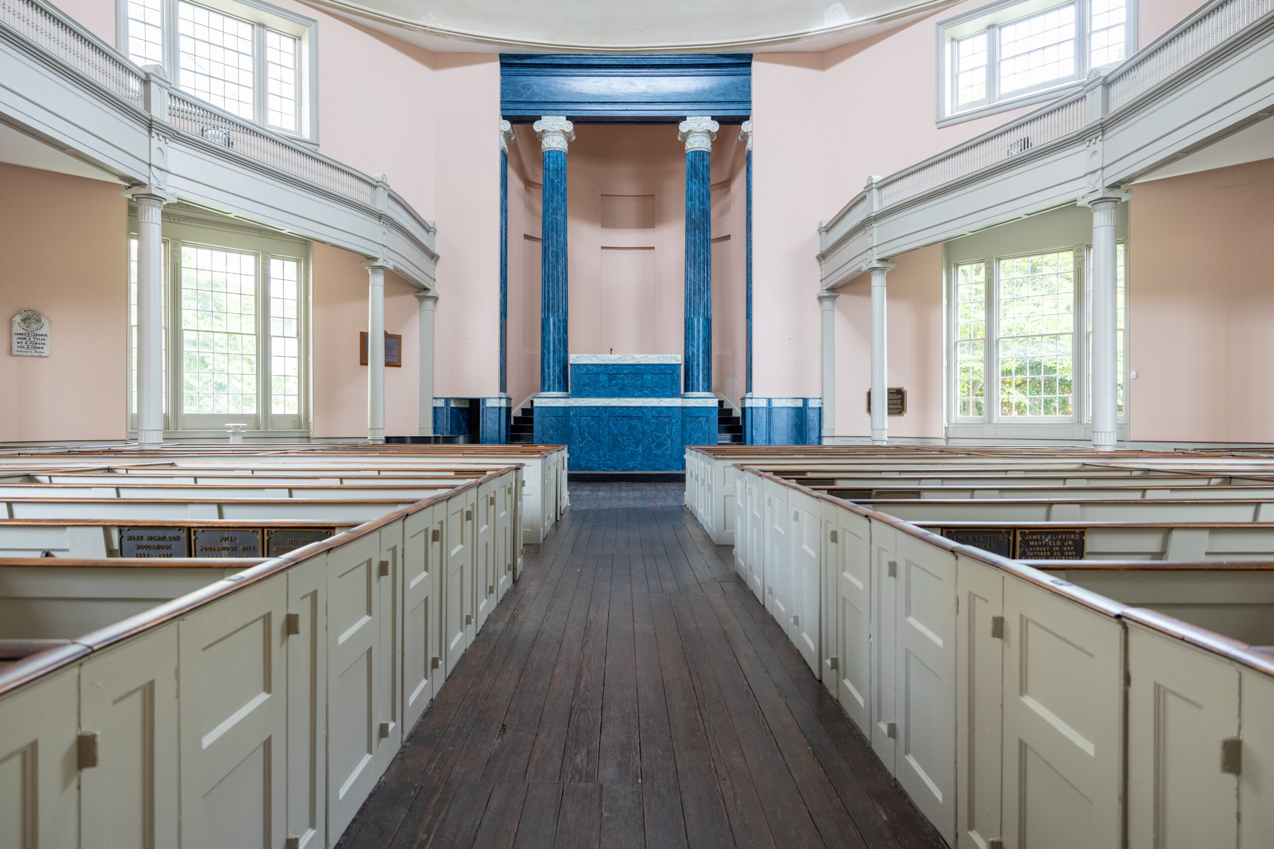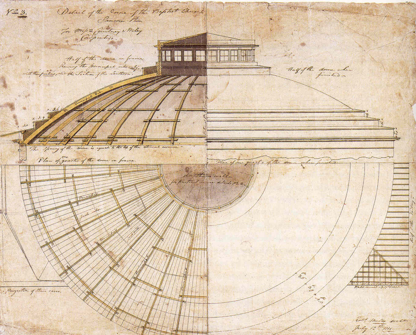 The unprecedented low-profile saucer dome that Mills placed over the auditorium is a Neoclassical feature favored by two of his mentors, Thomas Jefferson and B. Henry Latrobe. The slender, laminated, wooden ribs of the dome were invented by 16th century French architect Philibert Delorme. Mills utilized “Delorme’s Method” of dome construction to vault the large free-span rooms of the church. The wooden dome and cupola cover a broad expanse of space effectively allowing natural light to flood the interior.
