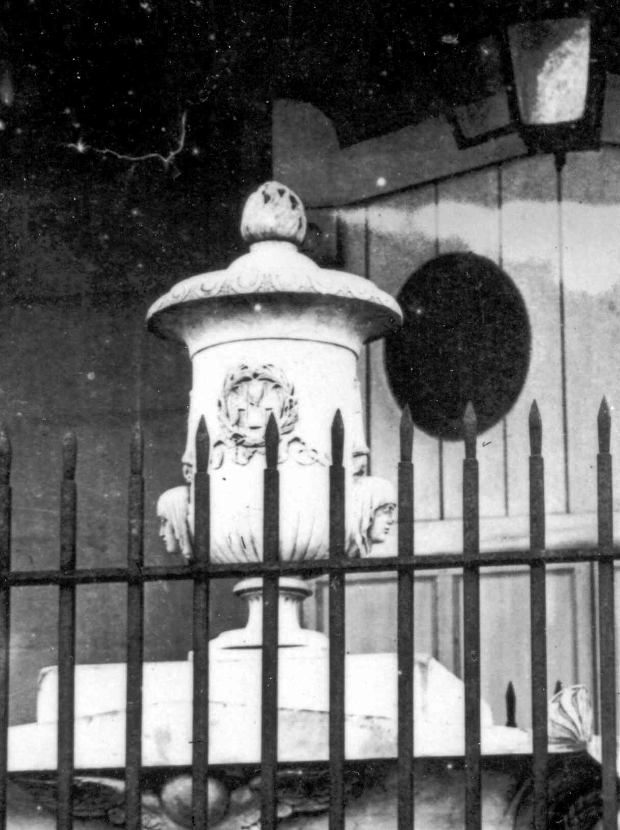 Mill's design uses Roman, Greek, and Egyptian motifs, along with funerary imagery, to embellish this innovative architectural form: a church also serving as a memorial monument. The center of the portico features a Roman inspired urn sitting atop of a sarcophagic base. Mills had the names of the victims carved into the walls of the sarcophagus. He decorated its cornice with a winged orb, representing the creation and preservation of life, often found on Egyptian temples. The marble urn is adorned with funerary symbols including drapery, stars, and a wreath with flying ribbons. The faces of shrouded women also appear, which can be traced back to a 1728 book of architecture that Mills was likely to consult. Mills also incorporated the urns seen on the portico frieze. These lachrymatories, or tear vials, recall the ancient Roman tradition of honoring the dead by collecting every tear shed during mourning.
