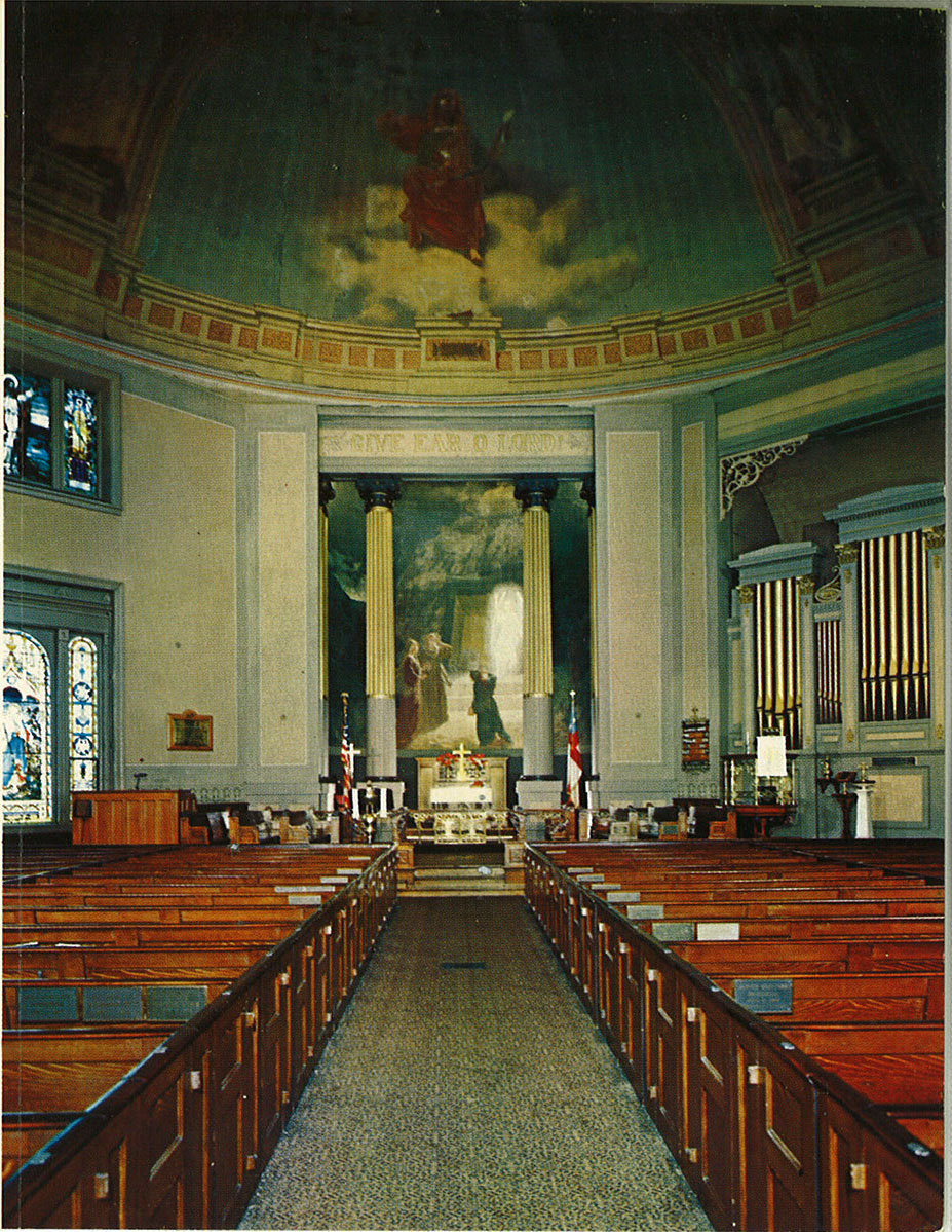 The interior of the church evolved aesthetically over time. Between 1845 and 1850, Richard Upjohn, the architect of New York’s Trinity Church and a major proponent of the Gothic Revival, filled the east-west cross aisles with pews, removed the central chancel, and extended the rail to incorporate a pulpit, lectern, and altar. Between 1874 and 1879, builders attached a Sunday school building called Teusler Hall to the east entrance, disrupting the symmetrical form of the church. Later additions included art glass windows, a painting of the Resurrection in the apse, and a dome fresco of the Angel Gabriel. (Seen below in this photograph from 1958.) These additions have since been removed.