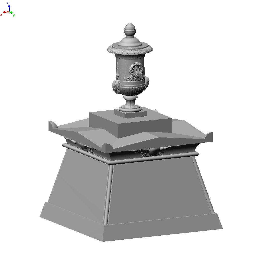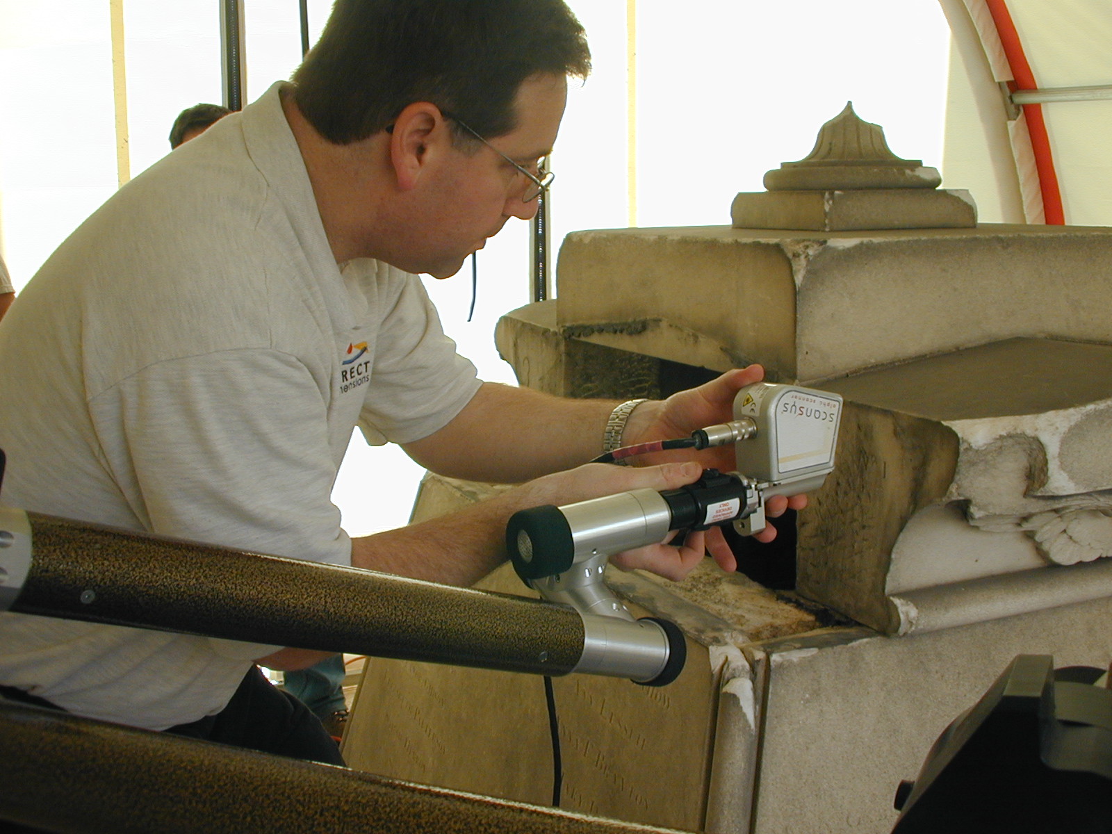 Historic Richmond was deeded the church in 1983. By then, water damage had caused extensive decay. Historic Richmond’s modest budget allowed them to handle routine maintenance; however, the accidental toppling of the urn in 1999 caused their efforts to move forward unexpectedly. What began as a simple plan to repair the urn grew into the replacement of the original monument and a four-phased comprehensive plan to restore the historic site. While studying the fallen urn, preservationists uncovered irreparable damage from decades of exposure to pollutants. After ruling out conventional restoration techniques, the only viable option was to dismantle the original monument and replace it with a replica. In 2003, Historic Richmond hired John Milner Associates to guide the replication project. They brought in Direct Dimensions, Inc. from Baltimore to perform a high-resolution, 3D laser scan of the monument, which gave them data needed to create a 1/3 scale model. This model is an exact copy of the monument as it existed before it was dismantled and reflects its deteriorated condition.