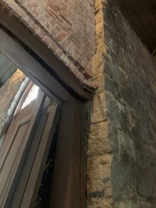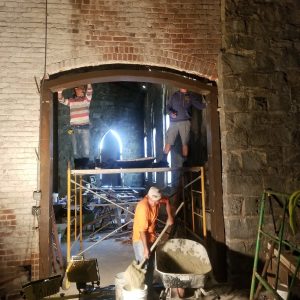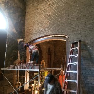 Over the past year, we are delighted to have worked closely with the Friends of the Pump House, whose volunteers have been providing maintenance and advocating for the historic structure, and the City of Richmond Department of Parks and Recreation to address some urgent repairs. This fall, we funded an emergency repair of a falling archway in the Pump House with the help of a generous bequest from Mrs. Elisabeth Reed Carter, a passionate supporter of preserving Richmond’s unique and authentic historic places. We are grateful to The Trent Corporation for completing the repairs despite the pandemic related closures. Before and after photos of the archway are shown below. In addition, the Friends of the Pump House have begun a phased window repair project.